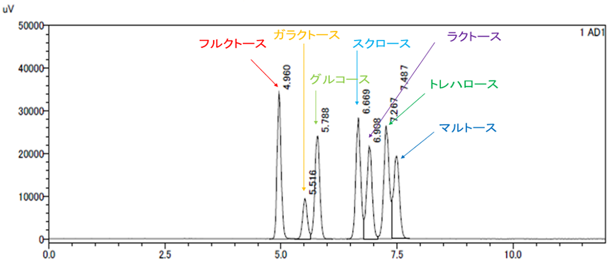 糖類7種の標準品を混合し、HPLC-ELSD測定を行いました。クロマトグラムを図1に示します。
