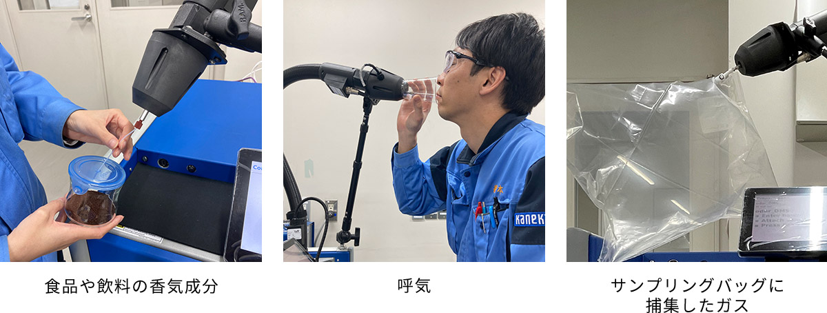 SIFT-MSは食品や飲料の香気成分、呼気、サンプリングバッグに捕集した室内のガス等を直接導入し、リアルタイムで定量することのできる装置です。気体成分をpptオーダーで検出できることからGC/MS分析では検出することのできない微量成分の分析に向いています。